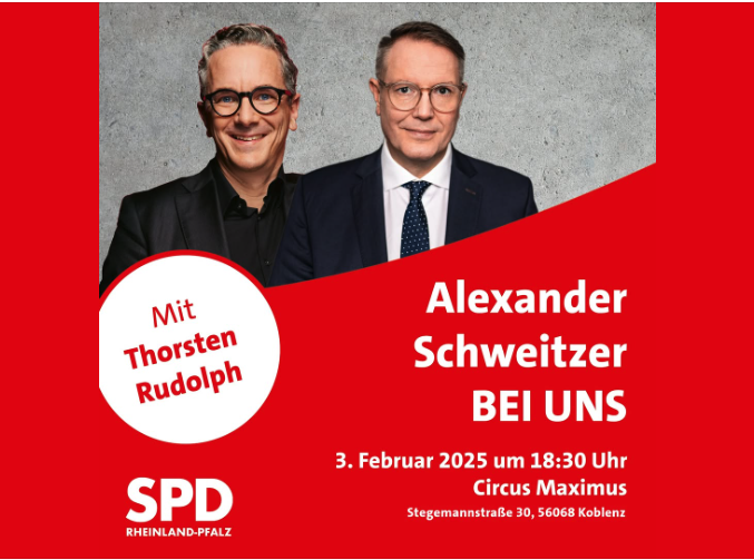 Rund drei Wochen vor der Bundestagswahl am 23. Februar werden vorwiegend bundespolitische Themen im Mittelpunkt stehen. „Ich bin Alexander Schweitzer, der auch Mitglied im Präsidium der Bundes-SPD ist, sehr dankbar dafür, dass er sich die Zeit nimmt, um nach Koblenz zu kommen. Denn so kurz vor der Wahl ist es wichtig, dass die Wählerinnen und Wähler die Möglichkeit haben, sich darüber zu informieren, wofür die Parteien stehen“, sagt Rudolph. „Und ich möchte natürlich klar machen, welche Politik ich als Kandidat für den Wahlkreis Koblenz vertrete und welche Ziele ich habe.“