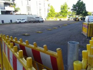 Kaum ist die Kirmes vorbei, geht es los mit der Umgestaltung des Jahnplatzes. Die städtischen Kolleg*innen beginnen, die Baustelle einzurichten.